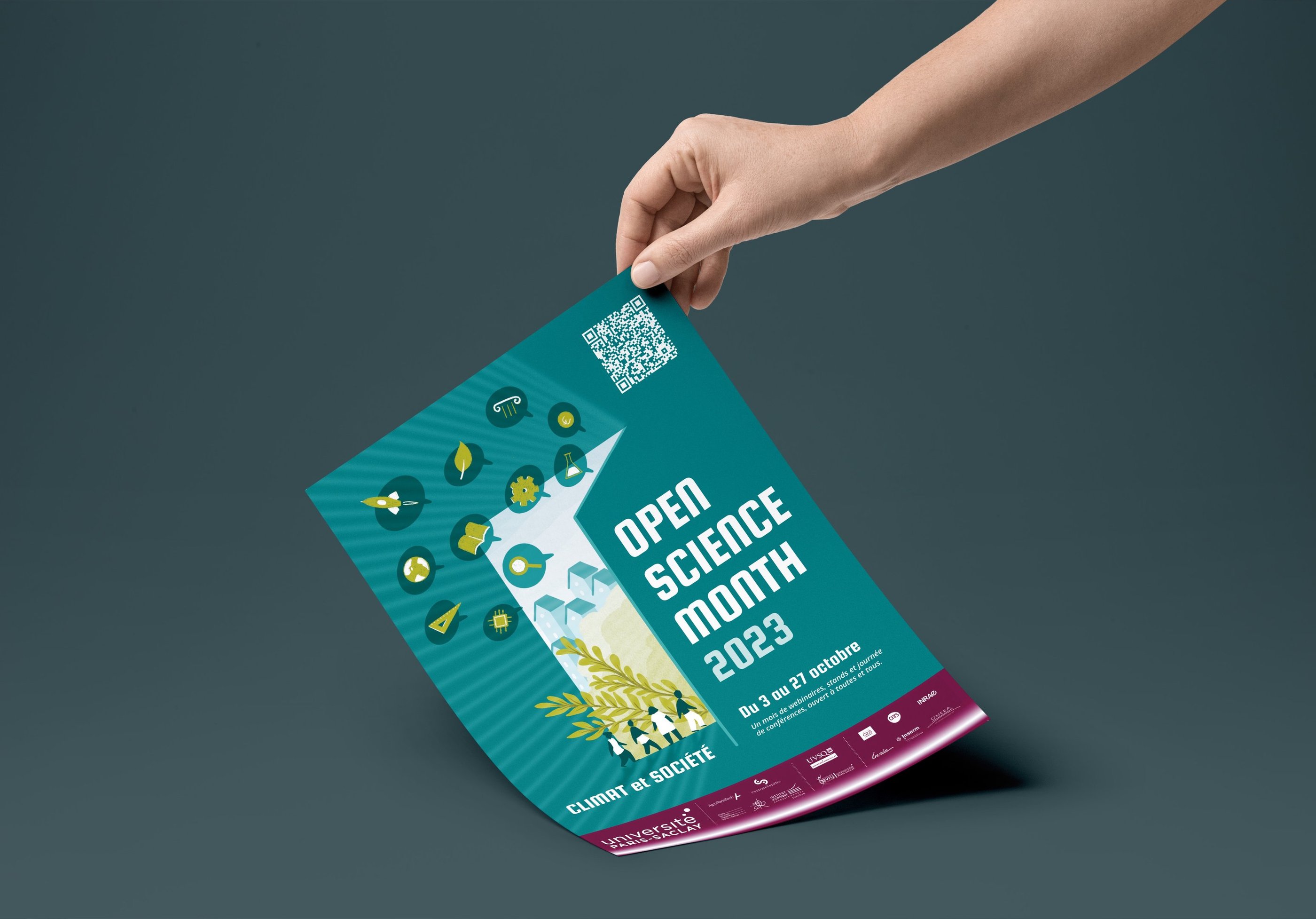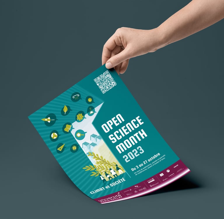 Création d'une affiche pour l'événement « Open Science Month » de l'Université Paris-Saclay, sur le thème de cette année : Climat et société. Réalisation de l'illustration à la tablette graphique.